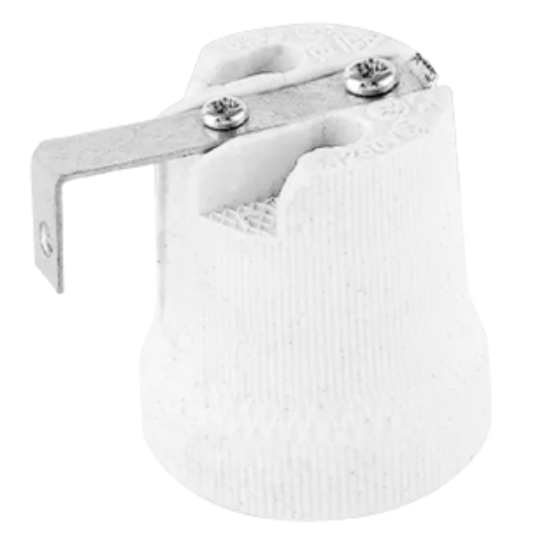 El portalámpara cerámico E27 con escuadra es un accesorio de instalación eléctrica para alojar lámparas de rosca estándar E27 (Edison). La escuadra en forma de «L» permite su fijación directa sobre superficies planas o en el interior de artefactos, apliques y plafones, tanto en instalaciones nuevas como en trabajos de recambio y mantenimiento.